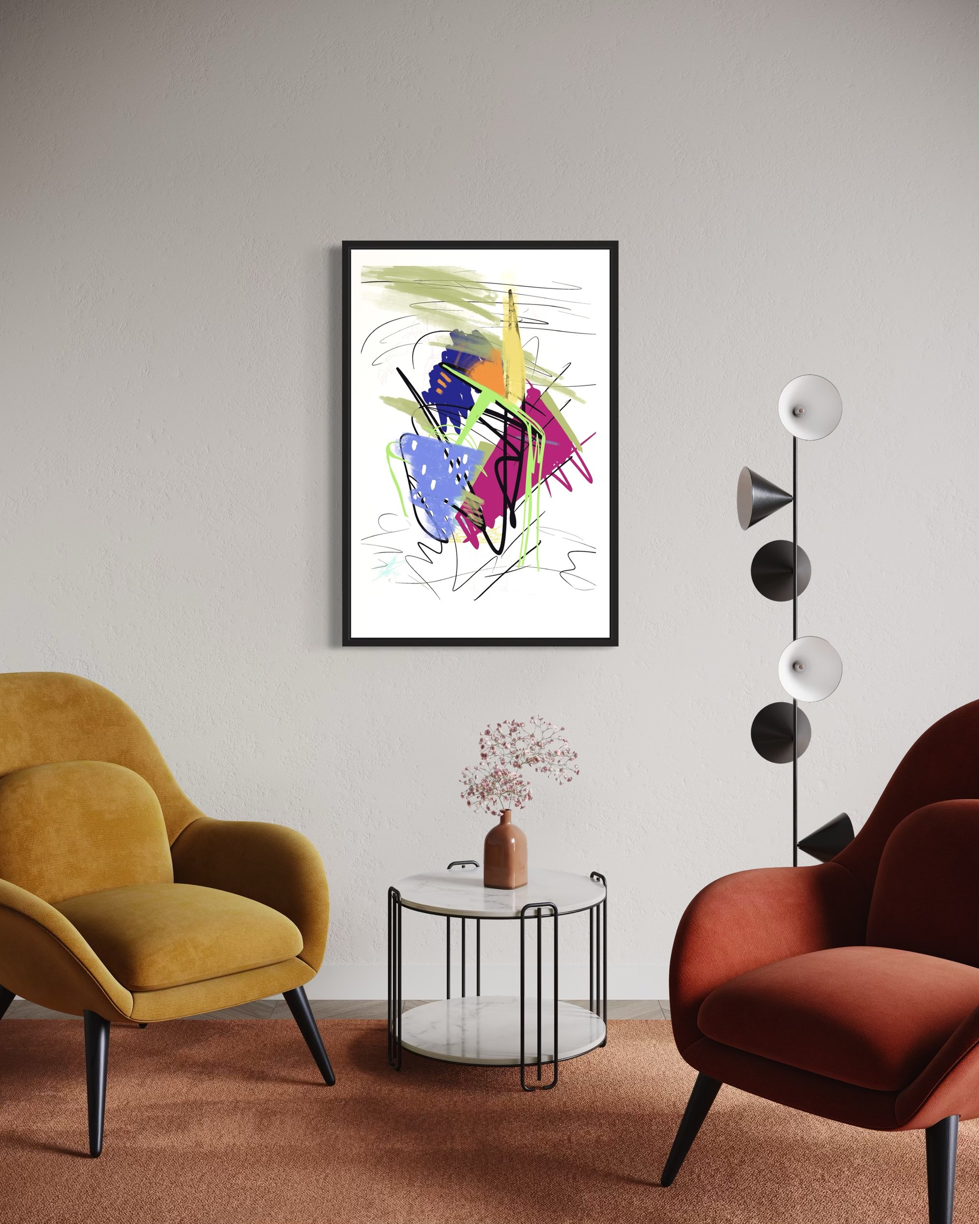 An Abstract produced with a phone and a finger. GyasiO takes design principles to the playground and through lucid thought creates abstracts like these. Spice up your blank walls with this head-turning framed canvas! This high-quality pine tree framed canvas comes with rubber pads on the back corners and wall mount that makes hanging the artwork hassle-free. What’s more, the frame gives the canvas a cool floating effect!